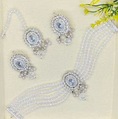 Sleek, luminous, and beautifully traditional — our Silver Stone Choker Set – Full Silver is a handcrafted ensemble designed for cool-toned festive and bridal elegance. This set includes a multi‑strand full silver beaded choker, matching earrings, and a maang tikka, each featuring a silver-toned oval stone centerpiece framed by intricate silver floral motifs, accented with white pearls and translucent dangling beads.