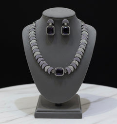 Indulge in timeless elegance with this purple zircon necklace and earring set, crafted to captivate. The necklace features fan-like segments encrusted with shimmering stones, leading to a bold rectangular purple zircon centerpiece framed in a radiant halo. The earrings mirror this regal design, each showcasing a matching gemstone surrounded by clear stones.