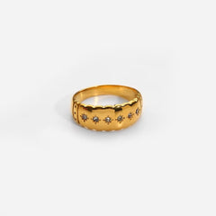 This stainless steel ring blends classic elegance with a touch of celestial charm. Featuring a scalloped edge and seven diamond-like stones set in starburst engravings, it’s designed to catch the light and elevate any look.